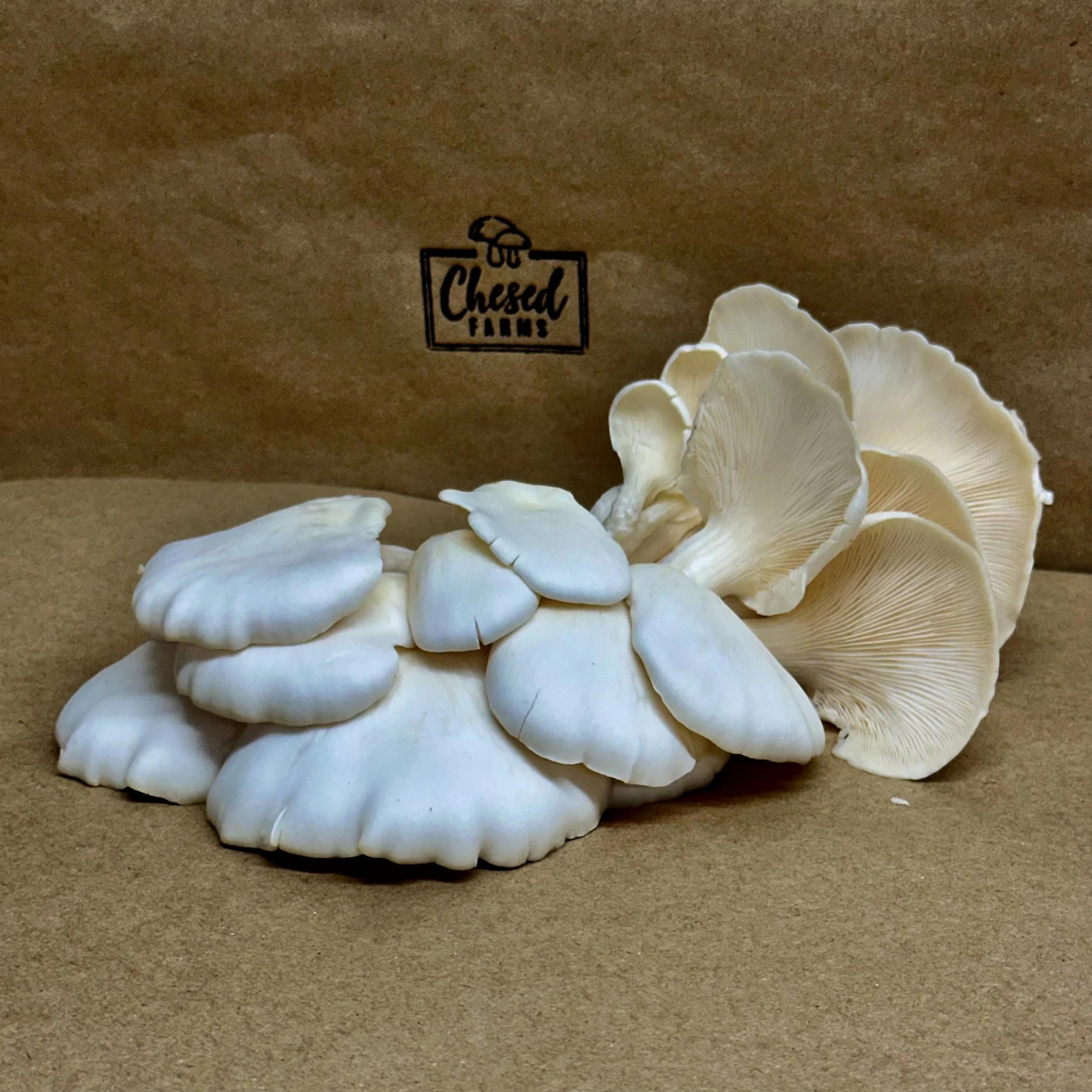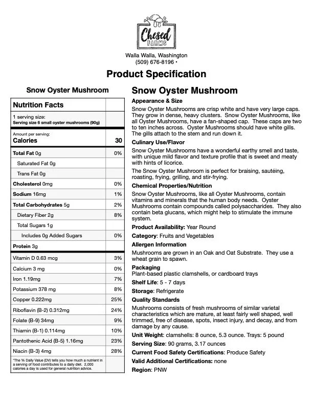 Fresh, farm-grown snow oyster mushrooms. Wonderful earthy taste. Snow oyster mushrooms have a unique mild flavor and texture profile that is sweet and meaty with hints of licorice. Perfect for braising, sautéing, roasting, frying, grilling, and stir-frying. These unique mushrooms originated on our farm. During our growing process we had a blue oyster batch that had an albino blue oyster growing. We were able to take tissue samples to begin growing our own snow oyster mushrooms.